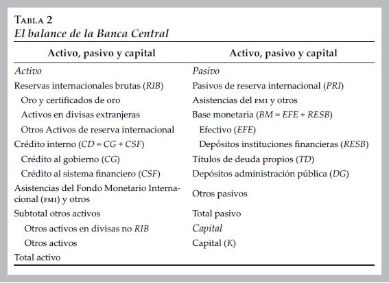 En lo sucesivo sostendremos que la estructura de activos y pasivos de la Banca Central refleja mayor información que lo que se piensa. Muestra las asimetrías del sistema monetario internacional, la estructura y marco institucional de la economía nacional y el régimen cambiario de facto. Pero, también, refleja la política monetaria de la Banca Central y el grado de inyección y extracción de componentes exógenos monetarios.