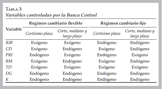 La tabla 3 resume el conjunto de variables de control de la Banca Central. En primer lugar, en un sistema cambiario flexible el acervo de reservas internacionales brutas (RIB) se encuentra bajo control de la Banca Central precisamente porque el mismo es menor que en el caso de un sistema cambiario fijo. Esto implica que en el primero de los casos la Banca Central no necesita acomodar la demanda de divisas.
