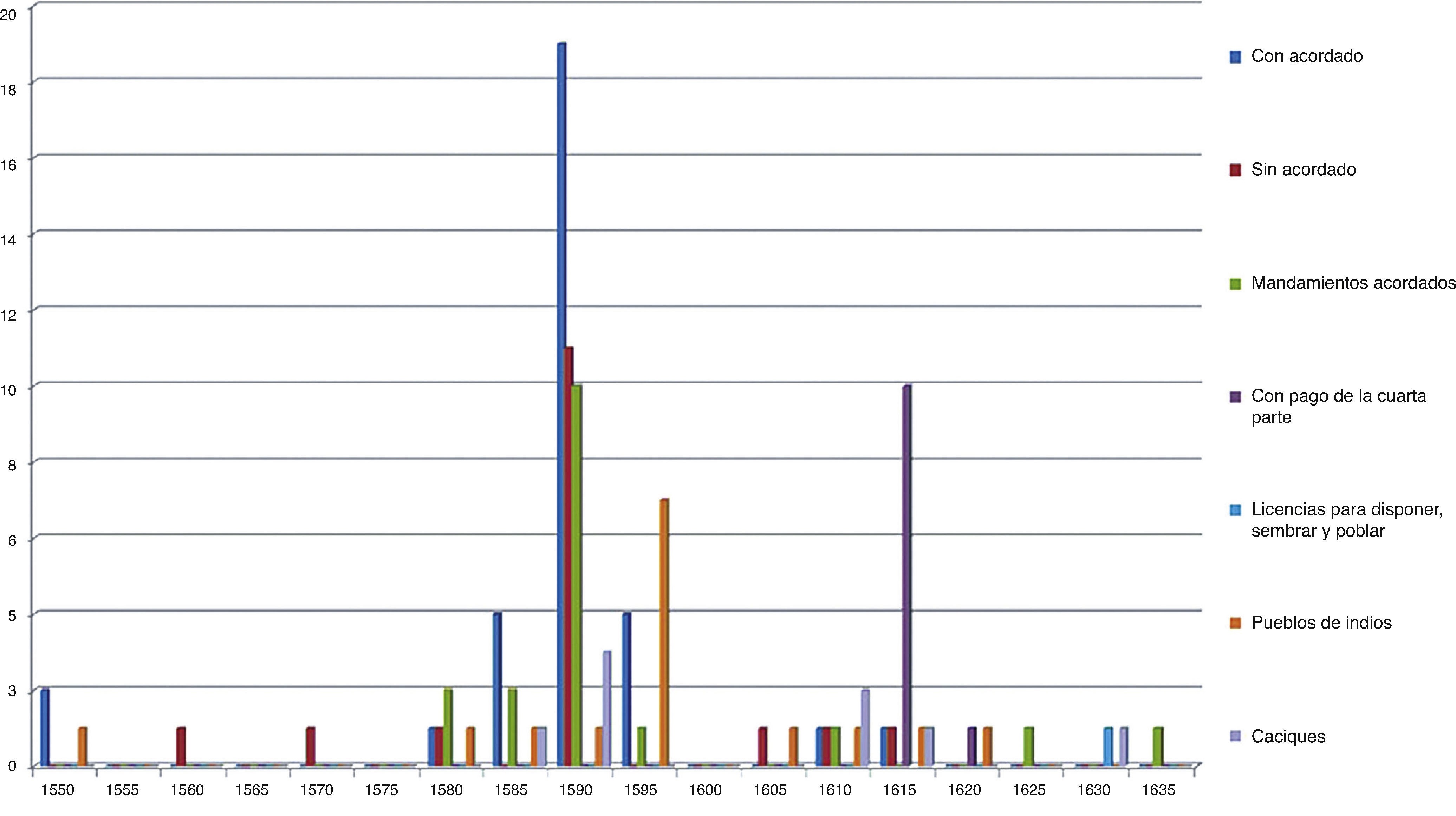 En la Nueva España las composiciones no tuvieron un efecto inmediato, pues la postura del virrey Luis de Velasco el mozo fue contraria a la voluntad del rey, a tal grado que postergó la implementación de los nuevos mecanismos de concesión de tierras porque consideraba que las medidas hacendarias afectarían a la economía de los colonos y comprometerían las actividades productivas del virreinato en su conjunto12. En lugar de ello, el gobierno virreinal entregó el mayor número de mercedes no onerosas a españoles entre 1590 y la primera década del siglo XVII, al mismo tiempo que continuaba con las congregaciones de los pueblos13.