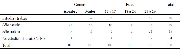 Un primer resultado de la encuesta era esperado. Los jóvenes que respondieron tienen un perfil de mayor calificación que el promedio de la región. Esto se puede apreciar en el Cuadro 1, donde un 80 por ciento de los jóvenes que respondieron se encontraba estudiando y un 55 por ciento estaba trabajando. Sólo un 4 por ciento era Ni Ni, lo cual contrasta con el porcentaje real de Ni Ni en la región, que se ubica más bien cerca del 20 por ciento.