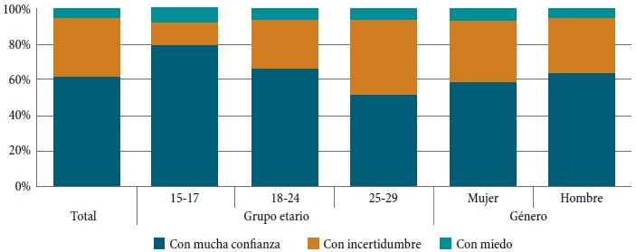 Con esta realidad en mente, un primer interés de la encuesta fue conocer la expectativa general de los y las jóvenes sobre el futuro. De manera interesante, más del 60 por ciento de los jóvenes latinoamericanos ve su futuro laboral con mucha confianza (Gráfico 1). A la inversa, cerca del 40 por ciento ve su futuro con incertidumbre o miedo.