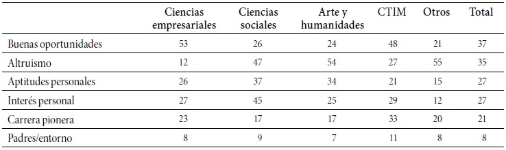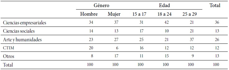 Nota: CTIM: matemática, física, química e ingeniería. Otros: agricultura, gastronomía, medicina y nutrición. Sólo se considera a jóvenes estudiantes.