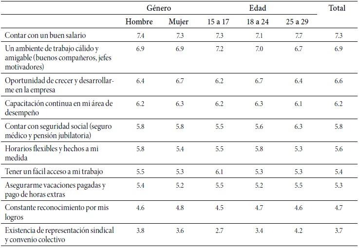 Todos estos aspectos son importantes para los jóvenes, pero entre ellos existe un ordenamiento. Cuando estos resultados son desagregados por género, no se encuentran mayores variaciones, salvo por la mayor valoración de las mujeres por la oportunidad de crecer y desarrollarse en la empresa, y por la mayor valoración de los hombres por horarios flexibles y fácil acceso al trabajo. Sin embargo, cuando es desagregado por edad, se cae en cuenta que existe una gran diferencia entre las expectativas laborales de los más jóvenes (15-17) en relación con los mayores (25-29) del estudio. En particular, la importancia de la protección social y de la representación sindical se va incrementando conforme avanza la edad, mientras que se reduce la importancia de la facilidad de acceder al trabajo y de un ambiente de trabajo cálido y amigable.