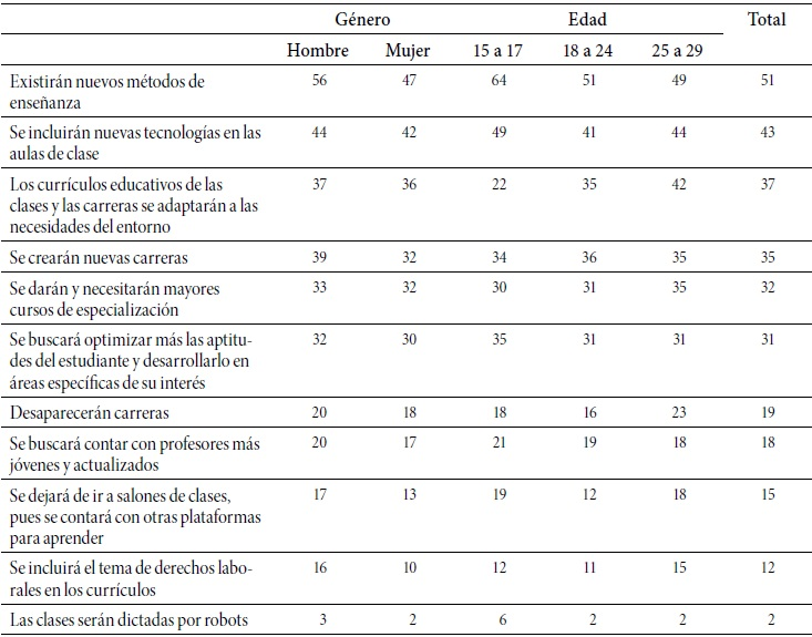 Los cambios en el empleo irán de la mano con cambios en la formación para el trabajo. De hecho, 79 por ciento de los jóvenes encuestados declararon que, de haber cambios en la educación, éstos los afectarán en mayor o menor medida. Los seis cambios más importantes que esperan los jóvenes son: nuevos métodos de enseñanza (51 por ciento), nuevas tecnologías en las aulas de clase (43 por ciento), currículos adaptados a nuevos entornos (37 por ciento), nuevas carreras (35 por ciento), necesidad de más cursos de especialización (32 por ciento) y optimización de las aptitudes del estudiante para desarrollarlo en áreas específicas (31 por ciento). Además, 19 por ciento de jóvenes piensa que desaparecerán carreras, habrá profesores más jóvenes y actualizados (19 por ciento), se dejará de ir a salones de clases, puesto que se contará con otras plataformas para aprender (15 por ciento), se incluirá el tema de derechos laborales en el currículo (13 por ciento) e incluso las clases serán dictadas por robots (3 por ciento).