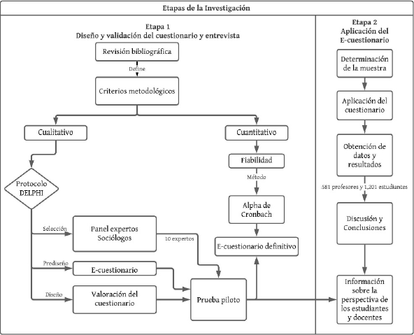 Las encuestas fueron distribuidas mediante un recopilador de datos perteneciente a Google on-line Google Forms y la información recabada se analizó con el programa SPSS (v.22.0). Se llevó a cabo un análisis de datos cuantitativos a través de estadística descriptiva. Así mismo, se utilizó la fiabilidad (Alfa de Cronbach) de los ítems analizados, en la escala, tanto para estudiantes (α = .822), como para profesores (α = .816), siendo superior a .8 en ambas situaciones por lo que se considera aceptable.