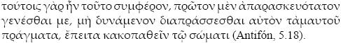 Pero, aún me pregunto si la expectativa siempre se cumplió plenamente. Tomemos, por ejemplo, el caso del mitileneo Euxiteo, en Antifón 5. Se trata, claramente, de un hombre relativamente joven, dado que sostiene (5.74-75) ser demasiado joven para conocer, de primera mano, las actividades de su padre en el tiempo de la revuelta mitilenea, la cual tuvo lugar no más de diez años antes del juicio. Pero sobre todo, el proemio de este discurso está cuidadosamente construido con un estilo grandioso e intrincado. El orador comienza con el topos de la inexperiencia, formulado antitética y quiásticamente: