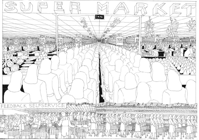 Resulta perturbador pensar que Pushwagner concibió Soft City en medio de los movimientos sociales que definieron la década de los sesenta para publicar su novela gráfica en el tiempo de alienación que “nos ha tocado vivir”, como dice Agamben. Al contrario del proyecto utópico de Nieuwenhuys, que ahora se puede dilucidar como aún más inalcanzable dada la condición de absoluta disparidad que nos ha legado el capitalismo tardío, el mundo dibujado por el artista noruego se percibe extrañamente cercano. No me refiero solamente a la idea de una sociedad mecanizada, cohesionada sólo por una administración tecnocrática que presiona a los individuos para hacerlos producir en el vacío, sino también a la representación arquitectónica que Pushwagner hace de su ciudad. El acomodo en avenidas y kilométricos edificios de departamentos resultarían familiares para cualquiera que viaje a las afueras de un centro urbano importante; la organización de los lugares de trabajo en amplios cubículos que prefiguran a las oficinas sin divisiones recuerdan a cualquier centro de trabajo, y las ilustraciones del supermercado comunican inmediatamente a los grandes almacenes del presente. La sociedad que aparece en estas ilustraciones, subsumida en un mundo de deberes, de estímulos e información, corresponde al problema que la utopía de Nieuwenhuys intentó solucionar: la “pobreza de la experiencia” que Benjamin (2009b: 168) juzga como la principal consecuencia del desarrollo de la técnica a favor del capitalismo, y que conlleva la más profunda alienación.