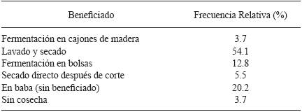 El beneficio es una parte esencial y determinante para obtener buena calidad de grano (proporciona los principios básicos de sabor y aroma) y acceder a ganancias durante la comercialización en el mercado nacional e internacional. El beneficiado incluye la fermentación, lavado y secado (Cuadro 3). El proceso de fermentación se realiza tradicionalmente al depositar el grano en cajones de madera bajo condiciones controladas.