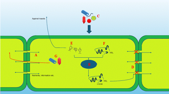 Figura 2 Componentes vegetales involucrados en las infecciones virales mixtas. El proceso normal de comunicación entre las células vegetales de las plantas implica la interrelación de estructuras tales como los plasmodesmos (A) y el núcleo (B); los primeros se encuentran en las paredes celulares que permiten el pasaje de moléculas en el citoplasma. En presencia de una infección viral (C), la célula contrarresta la acción mediante vías bioquímicas bien definidas, como la inhibición de la función de los plasmodesmos y el tráfico intracelular (D), la producción de metabolitos de respuesta específica (que pueden ocurrir antes o durante el desarrollo de la infección viral), (E) o el aumento en la producción de proteínas involucradas en los procesos de desintoxicación (F). Por otro lado, después de una internalización exitosa por dos virus, ocurre un efecto sinérgico de la infección viral mixta (G).