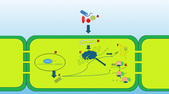 Figura 3 Silenciamiento génico a través del ARN de interferencia pequeño en células vegetales. La internalización del virus ocurre (A), el ARN viral está protegido por una cápside viral (B), el virus usa la maquinaria de transcripción celular para la síntesis de proteínas virales (C). La replicación del ADN vegetal tiene lugar en el núcleo (D) y se sintetiza un ARN de interferencia pequeño, que posteriormente madura y se exporta el citosol donde, después de algunas modificaciones, se produce un ARN de horquilla corta (E). El ARN pequeño puede actuar de varias maneras, tales como interferir con proteínas virales específicas (F), o unirse al ARN viral y a través del Complejo de Silenciamiento Inducido por el ARN (RISC, por sus siglas en inglés), que interfiere con la expresión de genes virales (G).