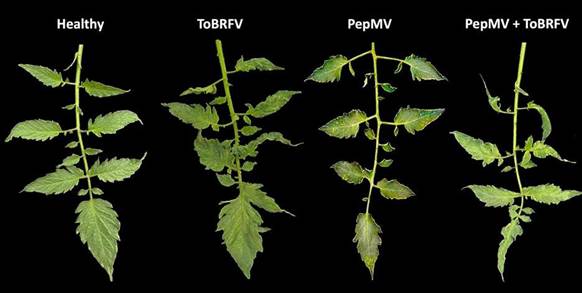 | Tomate/ Sinergismo | Tobamovirus y Potexvirus (ver síntomas en la Figura 3). | Las infecciones leves por PepMV precedidas por TBRFV pueden inducir síntomas característicos de cepas agresivas de PepMV. | Israel Klap et al. (2020) | |