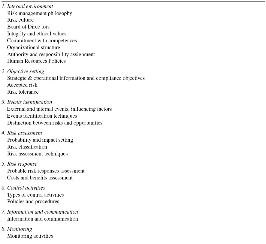 A Risk Disclosure Index was developed to measure the quantity and the quality of the risk information disclosed by the sample firms. The starting point for the construction of this index was the development of a checklist drawn from the eight components of the Enterprise Risk Management - Integrated Framework (COSO II Report). This choice is justified, firstly, because it constitutes the widest conceptual framework of risk management available and, secondly, because all the requirements established in the Spanish Unified Code of Good Governance are included in the COSO II Report.