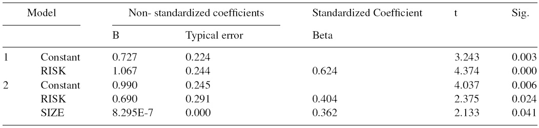 The regression results show a significant positive association (at the 0.05 level) between the RDI and both the RISK and SIZE variables, suggesting that the level of risk disclosure is higher both for riskier companies and big firms. In order to compare and ease the interpretation of the model, the standardized coefficient beta is used. Therefore, the final model is expressed as follows:RDI-09=0.404 RISK+0.362 SIZE