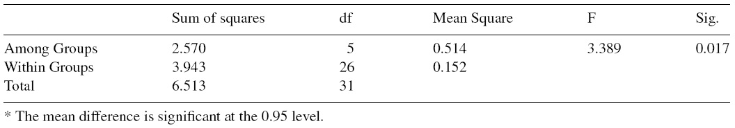 To confirm these results, a comparison between each sector and the financial and property sector was carried out (multitomous variable). Thus, an analysis of variance (ANOVA) was performed with a confidence level of 95%. The homogeneity test of the variances indicates a value significantly lower than 0.05 (0.017), hence it can be asserted that the differences of means between the sectors are statistically significant (Table 6).