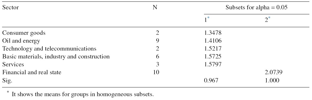 The Tukey test was applied in order to compare the means of each sector with the others. Those sectors which did not differ significantly were grouped in columns. The results show a significant difference of means at the level of 95% between the financial sector and the remaining sectors. The greatest difference of means with a significance level lower than 0.05 (0.011) is found between the oil and energy sector and the financial and real state sector.