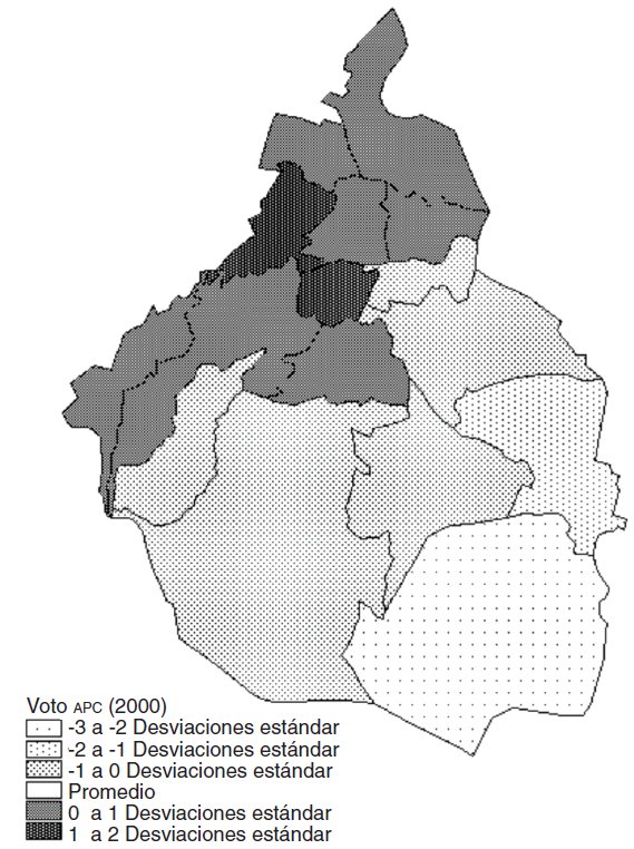 En específico, la evidencia mostrada en este estudio confirma que tanto la APC como el PRD se excluyen geográficamente (Vilalta, 2007 a ). También se observa que el voto para el PRD está más concentrado geográficamente que el voto para la APC. Asimismo se prueba que ambos partidos dependen de la segregación socioeconómica de la población en la ciudad, pero que la APC es más dependiente de esto que el PRD.