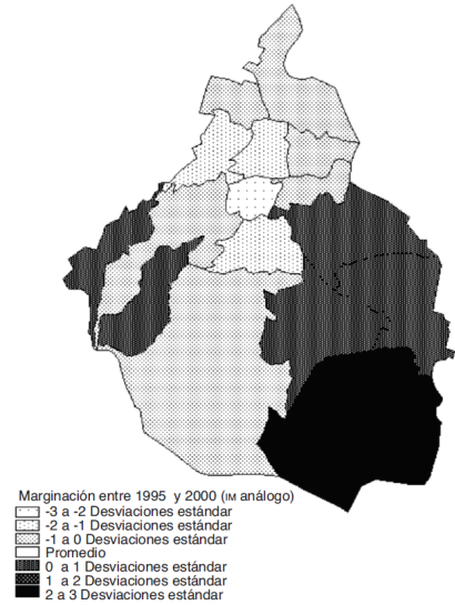 En números totales, la marginación aumentó en 8 delegaciones y disminuyó en las otras 8. Los dos mapas abajo presentan el cambio en la marginación en desviaciones estándar (véase los mapas 3 y 4). Geográficamente, el mapa 4 muestra que la marginación disminuyó en la parte central y aumentó en las zonas periféricas al norte y al sur de la ciudad.41