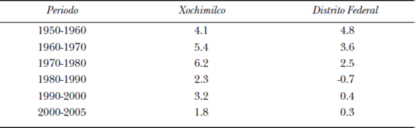 El crecimiento urbano en la delegación Xochimilco ha carecido de planeación, lo cual se manifiesta en que el ritmo de aumento de la población delegacional fue alrededor de ocho veces superior al del Distrito Federal durante la década 1990-2000, mientras que entre 2000 y 2005, pese a que disminuyó ostensiblemente, la tasa de crecimiento fue alrededor de seis veces superior a la del Distrito Federal (véase el cuadro 1). Este descontrolado incremento de la población indica que, a diferencia de otras áreas de la Ciudad de México, en la delegación Xochimilco han proliferado los asentamientos irregulares y las unidades habitacionales de interés social; esta delegación ha sido ininterrumpidamente objeto de la presión inmobiliaria de la Ciudad de México. El saldo desfavorable es que ni las autoridades delegacionales ni las del gobierno del DF han sido capaces de generar los mecanismos efectivos de política pública necesarios para preservar adecuadamente ese espacio como patrimonio universal de la humanidad. En particular, el vacío de autoridad, la tolerancia y la posterior regularización de la tenencia de la tierra que resulta de la práctica política clientelar han favorecido la continua expansión ilegal de asentamientos irregulares en la zona chinampera.