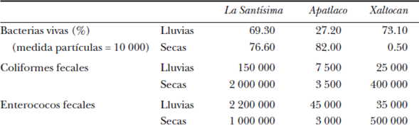 Entre los múltiples elementos que contaminan el agua de los canales del lago de Xochimilco se cuentan los desperdicios derivados de la actividad turística, el arrastre de sólidos por lluvias, y la contaminación derivada de la descarga de aguas provenientes de la planta de agua reciclada del Cerro de la Estrella,9 cuya tecnología resulta obsoleta y su diseño poco adecuado para el tratamiento de agua con fines agrícolas. Sandoval, en su tesis de maestría (2008), con datos de 2003 y 2004 evaluó el estado de degradación del agua de los canales de Xochimilco mediante análisis fisicoquímicos y microbiológicos que se realizaron tanto en la época de secas como en la de lluvias en alrededor de 20 sitios, entre ellos la zona de canales del Barrio de La Santísima.10 Destaca el aspecto microbiológico, pues al estudiar la cantidad de bacterias activas y en reproducción resultó que en La Santísima existía 69.3% en época de lluvias y 76.6% de biomasa bacteriana viva -prueba de citometría en flujo, muy por encima de las otras localidades-. En términos de unidades formadoras de colonias (UFC) se practicaron análisis de coliformes y enterococos fecales (véase el cuadro 2).