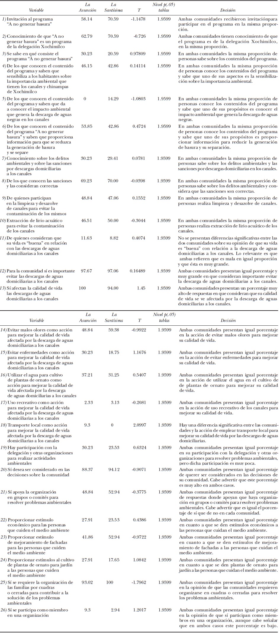 Se concluye que las medias de ambas localidades fueron similares a la media general, de manera que aun cuando no se hayan conocido los datos de contaminación del agua de La Asunción, las respuestas fueron tan similares que es presumible que las condiciones de deterioro ambiental fueran semejantes. En el anexo A se presenta un listado de las pruebas “T” y el nivel de significancia con que fueron probados los resultados.
