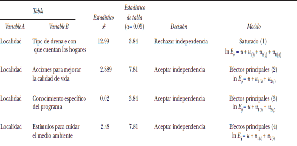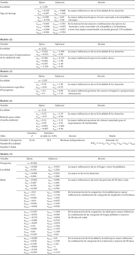 Se construyeron cinco modelos logarítmico lineales que arrojaron los siguientes resultados: a) Destaca el interés de los encuestados por saber más acerca del contenido del programa “A no generar basura”, pues tratan de conocer el impacto del deterioro ambiental y requieren información suficiente; los encuestados de La Asunción se muestran más preocupados al respecto. b) En general los encuestados están dispuestos a realizar acciones para mejorar la calidad de vida impulsados por la necesidad primordial de evitar la pestilencia del agua de los canales; esta intención es más notoria entre los que pertenecen al Barrio de La Asunción. c) Quienes muestran mayor determinación de atacar el problema ambiental son, entre todos los encuestados, los mayores de 60 años y los jubilados o dedicados a labores domésticas; al igual que en los aspectos anteriores destacan los de La Asunción. d) Los encuestados más dispuestos a participar son los que están conectados a la red de drenaje público, y una vez más destacan los habitantes de La Asunción. e) Entre quienes respondieron acerca de cuáles serían los mejores estímulos para participar, la principal respuesta fue la entrega de materiales de mejoras para la casa, y aquí también destaca la comunidad de La Asunción.