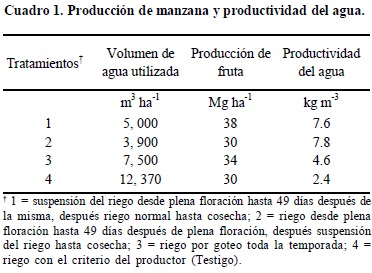 All of northern Mexico is dry. In general, water is increasingly scarcer and of lower quality. Apples in the state of Chihuahua are grown (approximately 30 000 ha) under irrigation, mostly with underground water extracted with pumping systems. Of the existing aquifers, 90% are over-exploited. The objective of the present work was to determine the effect of controlled deficit irrigation and subsurface irrigation on water productivity, vegetative growth, and fruit production and quality. The study was carried out during the 2003 growing cycle in a 20 year old apple orchard of the cultivar Top Red Delicious. Four treatments and eight replications were established; variables were analyzed using a completely randomized design, considering one tree as the experimental unit. The results obtained indicated that by irrigating once to field capacity during budding, followed by 49 days without water, and then resuming normal irrigation until harvest, there was a water savings of 60%. Furthermore, fruit yield increased up to 22%, and water use productivity increased up to three times (7.68 vs. 2.39 kg m-3) relative to the technology utilized by the grower (micro sprinkler irrigation, control), without affecting fruit quality. The harvested apples were, rather, heavier and firmer.