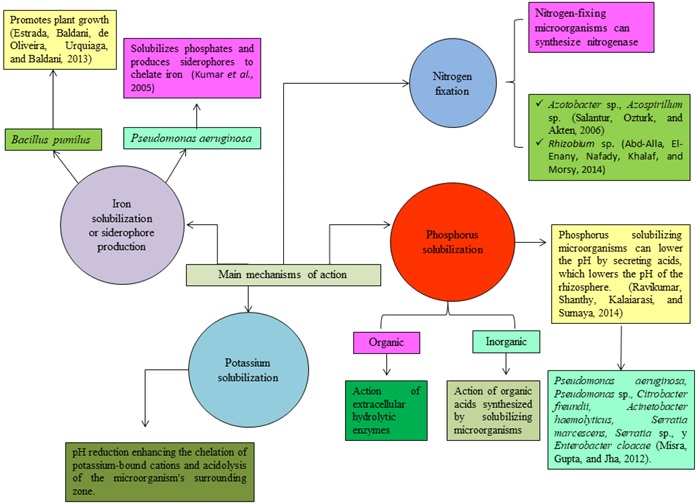 In general terms, the mechanisms of action employed by some of the microorganisms used to produce biofertilizers are summarized in Figure 3.