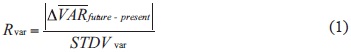 is the signal of climate change (defined as the difference between the climate in the scenario simulation and present climate simulation) and STDVvar is the interannual variability, as a measure of noise (computed as the standard deviation of projections). Rvar greater than 1 indicates that the signal of climate change is greater than the interannual variability, consequently the signal of climate change is robust, which relates with areas of low uncertainty and likewise to more confident projections; whereas Rvar lower than 1 indicates that the signal of climate change is lower than the interannual variability (noise dominates), consequently the signal of climate change is not robust, which relates with areas of high uncertainty.