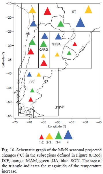 2. The projected temperature increase over southern South America depends on the season and the examined area. Particularly, it ranges from 1.5 to 5.5 °C, being highest over subtropical latitudes. Seasonally, the warming is greatest during spring. The regional model projects a maximum temperature increase (between 4 and 5 °C) over tropical and subtropical latitudes mainly during spring, and a large warming (3 °C) over high latitudes (south of 40° S) during summer. Warming found over northeastern Argentina and Paraguay is similar for winter, summer and autumn, and it is greatest during spring. Regarding temperature, the projected changes are statistically significant in all seasons (at a 95% confidence level) throughout the domain considered.