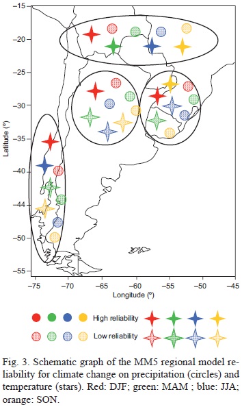 Consequently, the reliability of temperature projections is high, with signal-to-noise ratio greater than 1 over most of the study domain. On the other hand, the reliability of precipitation projections was low. However, the signal-to-noise ratio was close to 1, and even greater than 1 over southeastern Argentina in summer. Figure 3 summarizes the important findings of climate projections reliability over southern South America by the end of the 21st century.