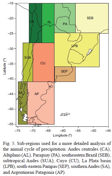 Figure 5 shows the sub-regions selected for evaluating the annual cycle of precipitation. These regions were chosen particularly due to differences in their precipitation regimes, and most of them were defined by Solman et al. (2007). Figure 6 shows the annual cycle of monthly precipitation for present (1970-1989) and future climate (2080-2099) under the SRES A2 scenario (left column) and projected precipitation changes (right column) from the MM5 regional model for the sub-regions defined in Figure 5.
