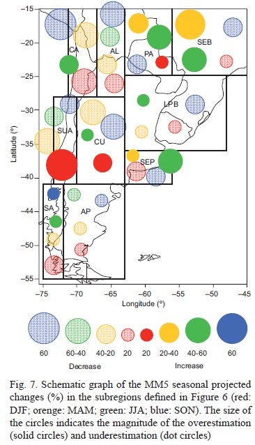 Changes in the interannual variability of precipitation are about ±1 mm day-1 throughout the study domain. In general, a slight increase in the interan-nual variability of precipitation is projected during summer, autumn and winter over central Argentina, Uruguay and the south of Brazil. However, larger negative changes (1 to 3 mm day-1) in interannual variability are apparent during autumn, winter and spring over central Chile.