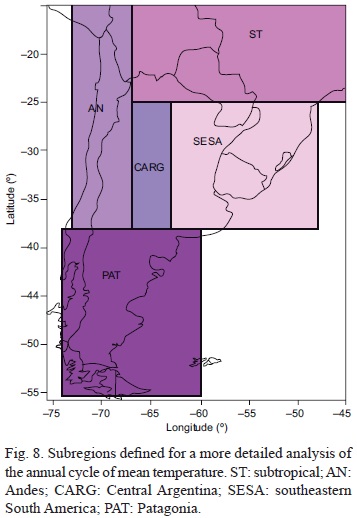 Regardless of the selected subregion, the projected warming is lower than 4.5 °C in the late 21st century. Particularly, a warming between 2 and 4.5 °C is found over ST, between 1 and 3 °C over CARG, less than 2 °C over PAT, less than 3 °C over SESA, and 2-3 °C over the AN regions. Furthermore, the largest warming is located over central-eastern Argentina, Uruguay, southern Brazil and the subtropical latitudes (ST, CARG and SESA) during autumn and spring, and with a lesser degree during winter. For example, the maximum rising temperature (around 4.5 °C) was found over ST during spring. Even though results discussed previously are in general agreement with Nuñez et al. (2008), the warming obtained here is of lower magnitude. Similar outcomes were also found by Blázquez et al. (2012) and Núñez and Blázquez (2014) from global climate models. As a final remark, in both in the late 21st century and in the late 20th century, the annual cycle of temperature is similar; the only difference is the higher temperature projected for future climate. Clearly, this has implications for the end of 21st century.