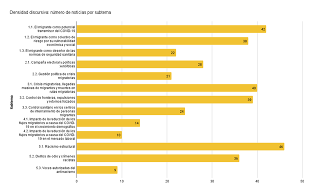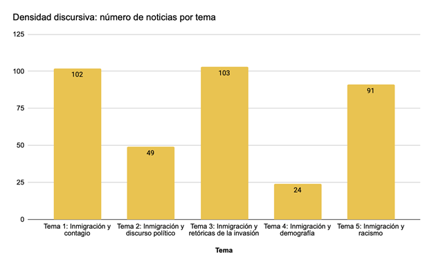 También es interesante resaltar que las noticias que se encuentran bajo el paraguas de las retóricas de la invasión, enfocadas en movimientos masivos de personas migrantes, tratan casi exclusivamente desde la perspectiva de la gestión de fronteras, los acuerdos internacionales y las políticas migratorias, y son casi inexistentes las aproximaciones planteadas desde la perspectiva de los derechos humanos. Asimismo, en lo que se refiere a las noticias que abordan el problema del racismo, pese a la destacada densidad discursiva que se identifica (como se verá en el apartado de discusión), es destacable su tratamiento mayoritario en noticias de carácter internacional ─el racismo estructural como algo que ocurre en otros países─, vinculadas, en el periodo analizado, a la alta cobertura mediática del asesinato de George Floyd, en mayo de 2020.