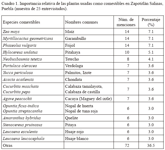 Plantas alimenticias. De entre las 82 especies comestibles registradas, las más apreciadas son el maíz (Zea mays), el garambullo (Myrtillocactus geometrizans), el frijol (Phaseolus vulgaris) y la pitahaya (Hylocereus undatus) (Cuadro 1). La importancia del maíz y el frijol no es sorprendente, pues se trata de los principales elementos en la dieta de los mexicanos. En contraste, el garambullo y la pitahaya son alimentos de importancia local, de los cuales, además, se llegan a obtener beneficios económicos por la venta de sus productos. Otras especies alimenticias de significancia son las verdolagas (Portulaca oleracea), los palmitos (Yucca periculosa) y la chondata (Acacia acatlensis).