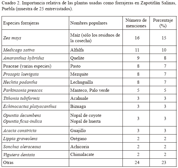 Plantas forrajeras. En esta categoría de uso se incluyen todos los vegetales, cultivados o silvestres. que son consumidos por los animales y especialmente por el ganado caprino. Las plantas comúnmente conocidas con el nombre genérico de pastos (varias especies de la familia Poaceae). además del rastrojo derivado de la cosecha del maíz. resultaron ser las de mayor importancia en este rubro. Otras especies también significativas en la alimentación del ganado caprino son el mezquite (Prosopis laevigata). la alfalfa (Medicago sativa) y la lechuguilla (Hechtia podantha) (Cuadro 2). De todas ellas se aprovechan las hojas y otras partes vegetativas. mientras que del mezquite se utilizan también los frutos. los cuales incluso se colectan y almacenan para la comida de los animales domésticos en épocas de sequía.