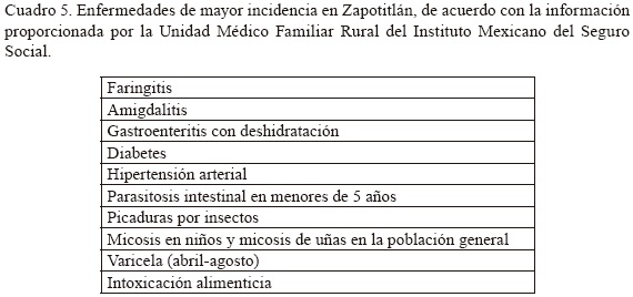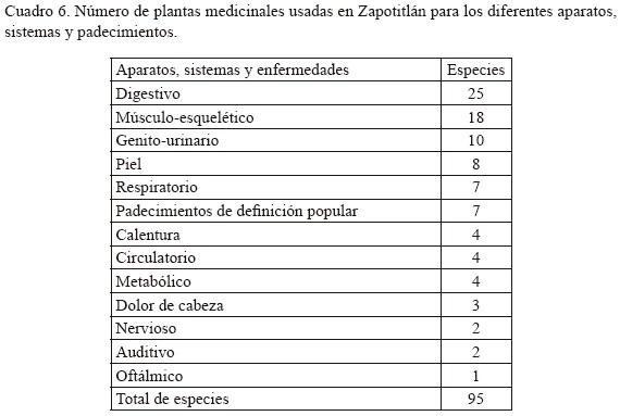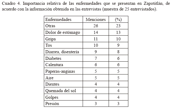 Enfermedades y plantas medicinales. La encuesta referente a las enfermedades de mayor incidencia entre la población de Zapotitlán reveló que los padecimientos considerados como los más importantes son el dolor de estómago, la gripa, la tos y la diarrea (Cuadro 4). Es interesante mencionar que algunos de estos datos coinciden con los proporcionados por el médico de la Unidad Médico Familiar Rural del Instituto Mexicano del Seguro Social (Cuadro 5) y se refleja en el gran número de plantas medicinales usadas para la curación de estos padecimientos y/o síntomas (Cuadro 6). En el caso de las dolencias gastrointestinales destacan el orégano (Lippia graveolens) y el ítamo real (Turnera diffusa), mientras que para las otras enfermedades son muy apreciadas la lengua de conejo (Sedum allantoides), el popote (Gymnosperma glutinosum) y el barredor (Cordia curassavica). Por otra parte, se encontró que existen síntomas que la población reconoce como enfermedades diferentes a las antes mencionadas y para cuya curación tienen plantas específicas. Ejemplo de ello es el caso del dolor de cabeza, para el cual se emplean las hojas frescas del gigante (Nicotiana glauca). Adicionalmente, hay una serie de padecimientos que pudieran considerarse de filiación cultural, los cuales no entran dentro del cuadro básico de enfermedades que trata la medicina oficial y entre los que se puede mencionar el "aire", para cuyo tratamiento se usa la ruda (Ruta chalepensis).