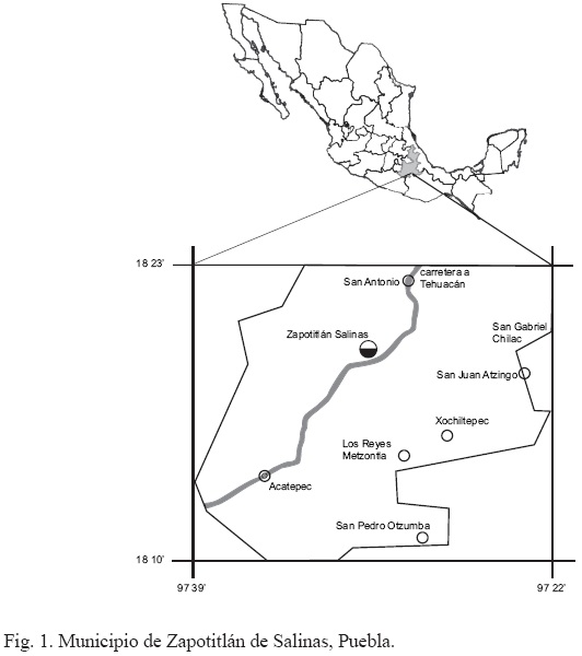 La comunidad de Zapotitlán Salinas es la cabecera del municipio del mismo nombre (Fig. 1). Se encuentra enclavada en un valle ubicado en la porción occidental del Valle de Tehuacán-Cuicatlán, ocupando una superficie de 485 km2. Se caracteriza por la temperatura media anual de alrededor de 21° C, con una canícula bien definida a la mitad del período de lluvias y la precipitación media anual de 400 a 450 mm. Desde el punto de vista edáfico, en la mayor parte del área los suelos son someros, pedregosos y muestran diferentes niveles de alcalinidad y salinidad, producto de la influencia de los diferentes substratos geológicos presentes en el sitio. Las principales unidades de suelos citadas para la región son: litosoles, cambisoles cálcicos y xerosoles cálcicos derivados de evaporitas del Cretácico Inferior y Medio, complementados con regosoles y fluvisoles calcáricos formados por materiales transportados, derivados de sedimentos aluviales (López-Galindo et. al., 2003; Oliveros-Galindo, 2000). Las comunidades vegetales localizadas en la región de Zapotitlán son el mezquital o selva baja perennifolia con espinas laterales (con prevalencia de Prosopis laevigata); el matorral espinoso (con Mimosa luisana, Acacia farnesiana, Cordia curassavica y Fouquieria formosa); la tetechera (asociación con abundancia de Neobuxbaumia tetetzo), el cardonal (en el que destaca Cephalocereus columna-trajani); el izotal (matorral con Yucca periculosa); el chaparral o mexical (con Brahea nitida y Dasylirion serratifolium); la tetechera-candelillar (con Neobux-baumia tetetzo y Euphorbia antisyphilitica), la selva baja caducifolia (con Myrtillo-cactus geometrizans, Bursera schlechtendalii y Bursera aptera) (Oliveros-Galindo, 2000; Osorio-Beristain et al., 1996; Valiente-Banuet et al., 2000).