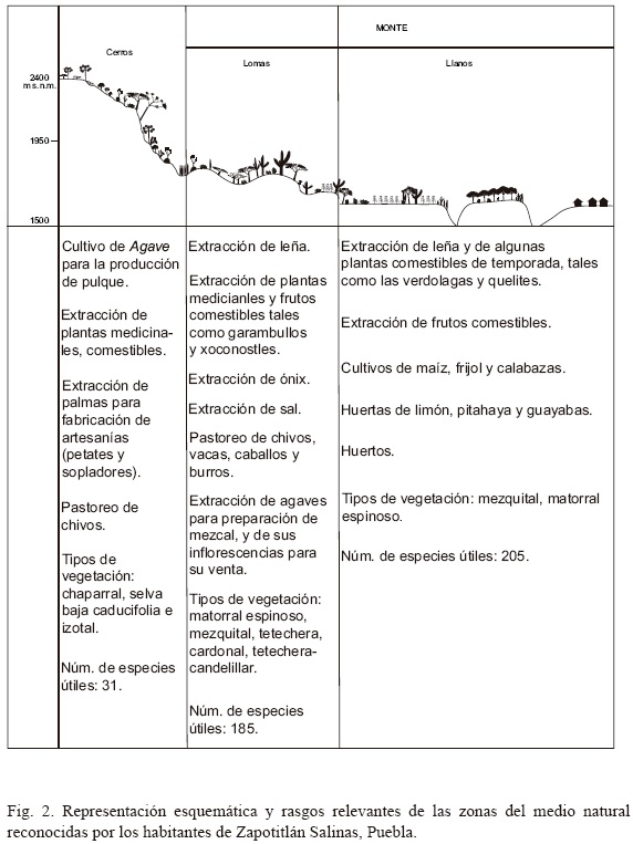 Cerros. Están en las partes más altas del área de estudio (1800-2400 m s.n.m.), sus suelos son de color negro, y se dice que, de no presentar tantas piedras, serían los mejores para sembrar. Las comunidades vegetales en estos sitios corresponden a chaparrales, selvas bajas e izotales, de donde se extraen 31 plantas útiles, entre las que se encuentran las medicinales (Heterotheca inuloides, Margaranthus solanaceus), las combustibles (Dasylirion serratifolium, Quercus sp.), las alimenticias (Porophyllum tagetoides) y las de uso artesanal (Brahea dulcis). En las porciones planas de los cerros se localizan sitios con influencia humana que incluyen cultivos de maguey (Agave atrovirens) y corrales de ganado caprino de libre pastoreo; los sitios en donde se ubican estos últimos se van rotando cada determinado tiempo, con el objeto de fertilizar el suelo para el propio cultivo del maguey.