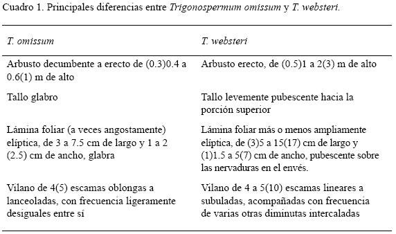 El taxon nuevo difiere de las demás especies conocidas de Trigonospermum en ser planta acuática o subacuática con tallos fistulosos y radicantes, en sus hojas con las bases pecioliformes muy anchas, en su inflorescencia organizada a manera de conjunto paniculiforme folioso, así como en la forma de las corolas de las flores liguladas.