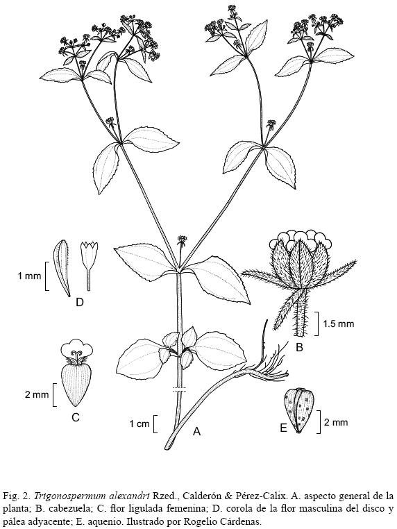 Trigonospermum alexandri Rzed., Calderón & PérezCalix sp. n. Fig. 2.