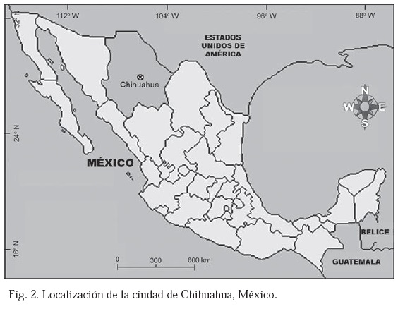 La ciudad de Chihuahua se localiza en la región central del estado de Chihuahua, México (Fig. 2), entre los 28o39' N-28°36' N y los 106o10' W-106°06' W, entre 1450 y 1320 m s.n.m. El clima es extremoso, seco a semiárido, con régimen de lluvias en verano. La región recibe 320 mm de precipitación anual promedio. La temperatura media anual es de 18.6 oC y la humedad relativa para un año promedio es de 47% (Anónimo, 2000).