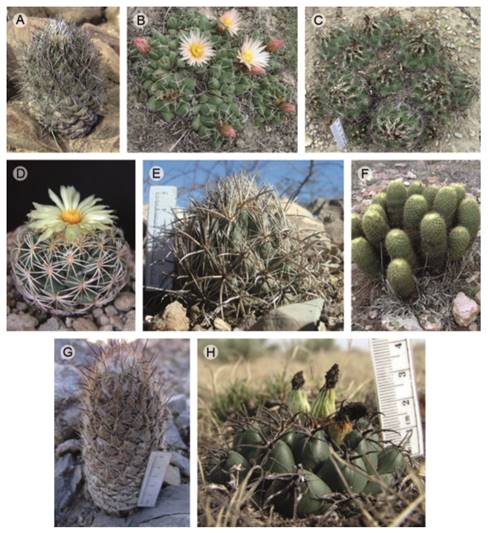 Fig. 2. Caracteres cualitativos de Coryphantha. Tipo de crecimiento: A. solitario (C. salinensis); B. ramificado (C. maiz-tablasensis); C. agrupado (C. nickelsiae). Forma del tallo; D. globosa (C. retusa); E. ovoide (C. kracikii); F. cilíndrica (C. erecta); G. cilíndrica ovoide (C. durangensis); H. globosa deprimida (C. pycnacantha).