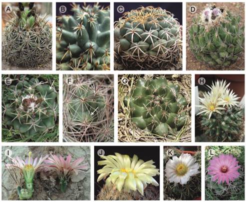 Fig. 3. Caracteres cualitativos de Coryphantha. Forma del tubérculo. A. cónica; B. cilíndrica; C. gibosa; D. cónica deltoide; E. surco completo; F. surco incompleto; G. sin surco; H. glándulas extraflorales; I. tépalos con margen fimbriado; J. flores de color amarillento; K. flores de color blanquecino; L. flores de color magenta.