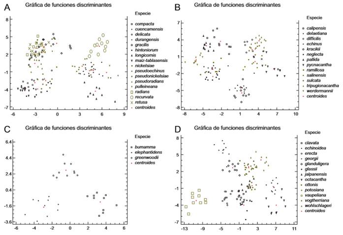 Se obtuvieron 12 funciones discriminantes estadísticamente significativas (P<0.05) (Cuadro 5). La primera función discrimina a Coryphantha potosiana de C. georgii y C. octacantha. (Fig. 5D). La segunda función diferencia al grupo de C. clavata, C. erecta, C. georgii, C. glassii, C. jalpanensis, C. octacantha, C. potosiana y C. vogtherriana de C. echinoidea, C. glanduligera, C. ottonis, C. vaupeliana y C. wohlschlageri (Fig. 5D). La tercera función discriminante separa a C. vogtherriana de C. octacantha. Se registró el total (Cuadro 3) de casos correctamente clasificados.