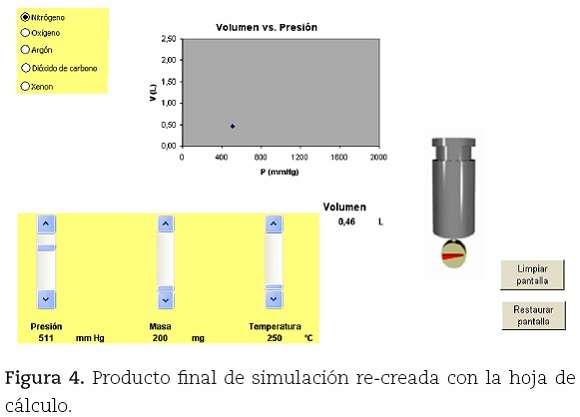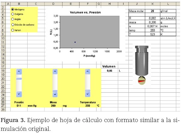 Por último, se puede pegar una imagen de un cilindro-émbolo. Una forma de obtener esa imagen es copiar y pegar la pantalla con la simulación original y recortar de ella la imagen del cilindro-émbolo. Para copiar la pantalla se recurre al botón del teclado Imprimir la pantalla, con lo que se obtiene una planilla de cálculo con un formato bastante similar a la simulación original (figura 3). Al ir modificando los valores de presión, el punto en el gráfico "recorre" la hipérbola equilátera correspondiente a la ley de Boyle.