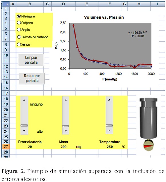 Siguiendo los trabajos de Sinex, se presenta un ejemplo (figura 5) donde se ha incorporado, a la simulación recreada, una barra de desplazamiento que permite la inclusión de un error aleatorio en los volúmenes calculados. Esta barra genera valores del 0 al 20, que son tenidos en cuenta en el cálculo de volumen con error aleatorio (V*). A las tablas que muestra la figura 2 se agrega una columna con los valores de este nuevo volumen que se calcula agregando el siguiente término a la fórmula de volumen (V =nRT/P): +$B$27*ALEATORIO. ENTRE(−5;5)/1000.