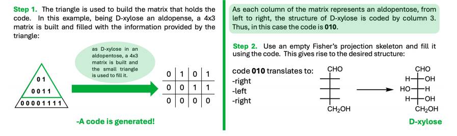 Many mnemonics and binary codes have been proposed previously, especially for the eight aldohexoses, still it is of great importance to mention that our proposal does not generate the same codes found in literature. For D-talose we can find some binary codes as 1001 shown by Rosenblatt (Rosenblatt, 1965), or 0111 suggested by Klein (Klein, 1980) and later by Zheng (Zheng, 2015), but by using the Aldoses’ Triangle we can obtain 1110 as the code for the latter aldohexose mentioned. Of course, there is the probability of having coincident codes, on the graphical abstract we can see that for D-galactose the code generated by the Aldoses’ Triangle is 0110 which is exactly the same proposed by Zheng for this same sugar, but it is not the same as 0011 presented by Rasenblatt almost sixty years ago, so we would like to mention that this mnemonic is not a mere repetition of what we can find previously published. Finally, the mnemonic proposed here generate a code which gives us a structure of the sugar, and this could be complemented with some other applications reported in the literature. Once the Fischer projection is obtained by the Aldoses’ Triangle, we can convert it to its corresponding angular line representation as proposed by Moreno (Moreno, 2012). On the other hand, we can use the simple paper model proposed by Mak (Mak, 2018) to cyclize monosaccharides from Fischer to Haworth projections, as well as the “push-pivot- pull” mnemonic described by Butler (Butler, 2021) to generate the Natta (zigzag) projection or staggered bond-line structure from the corresponding Fischer projection, or with the Arrow-Rotation-Method (ARM) developed by Hallal and Tlais (Hallal and Tlais, 2023) to interconvert zigzag structures and Fischer projections.