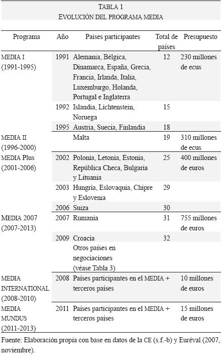 Durante sus 20 años de existencia, el programa MEDIA (CE, s.f.-b) cuenta con cuatro ediciones y ha ampliado el número de los países participantes, de los 12 iniciales hasta los 32 actuales. Como muestra la Tabla 1, el programa ha seguido la misma evolución que la propia UE en sus diferentes ampliaciones. Cada una de las ediciones ha tenido una duración de cinco años, aunque la edición actual (2007-2013) se ha ampliado hasta siete. Así mismo el programa se ha internacionalizado como resultado de la necesidad de la industria europea de estar presente en el mercado global. En primer lugar, se hizo una experiencia piloto, conocida como MEDIA INTERNATIONAL, entre 2008 y 2010, y posteriormente se aprobó el programa MEDIA MUNDUS para el periodo 2011-2013. De esta manera, la UE puede dar apoyo a proyectos audiovisuales que sean el resultado de la colaboración entre los estados miembros y terceros países. Otro de los elementos en incremento ha sido el presupuesto, que pasó de los 230 millones de ecus8 en 1991, a los 755 millones de euros para el periodo 2007-2013.