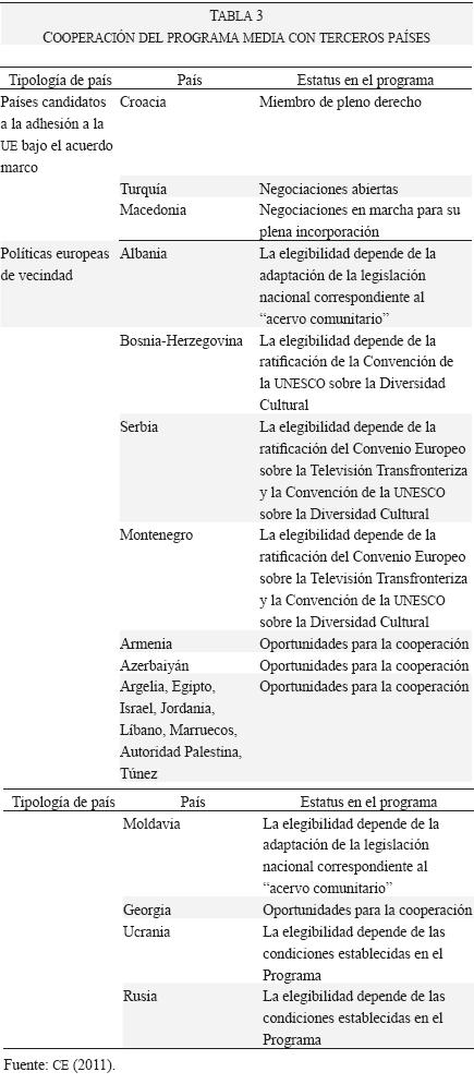 Como complemento a la acción exterior, el programa MEDIA mantiene también una línea de cooperación con otros países. Como muestra la Tabla 3, entre ellos se encuentran países candidatos a ser miembros de la UE y otros que por razones de vecindad mantienen una relación estrecha con la misma.